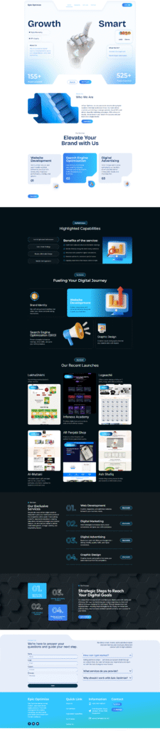 এপিক অপ্টিমাইজ-এ, আমরা এমন স্মার্ট কৌশল তৈরি করি যা ব্যবসাকে শক্তিশালী ডিজিটাল ব্র্যান্ডে রূপান্তর করে। আমাদের সমাধানগুলো মানুষের সাথে যুক্ত হতে, প্রবৃদ্ধি বাড়াতে এবং পরিমাপযোগ্য ফলাফল আনতে তৈরি করা হয়েছে।